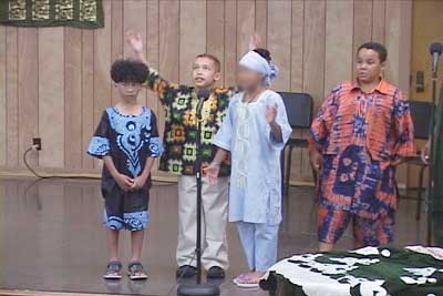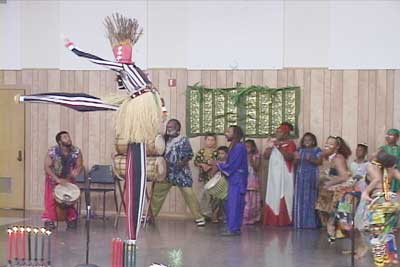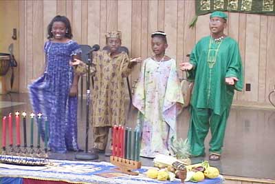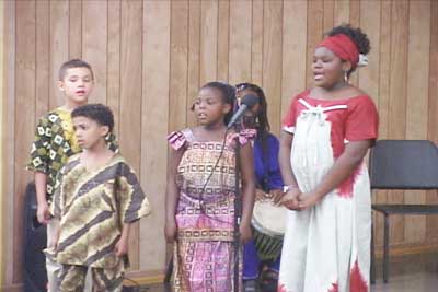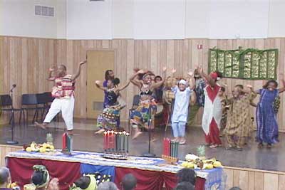An ensemble of twelve children accompanied by the Kabasa West African Dance and Drum Ensemble and Ms. Baity on the piano sang eight songs, each representing and explaining the seven social and spiritual principles of Kwanzaa including a reprise of the foundation principle, UMOJA. The seven principles, in order, are UMOJA, KUJICHAGULIA, UJIMA, UJAMAA, NIA, KUUMBA and IMANI. The songs are meant to bring a greater understanding of the Kwanzaa principles to children as well as adults. A CD of the Nguzo Saba will be released later this fall.